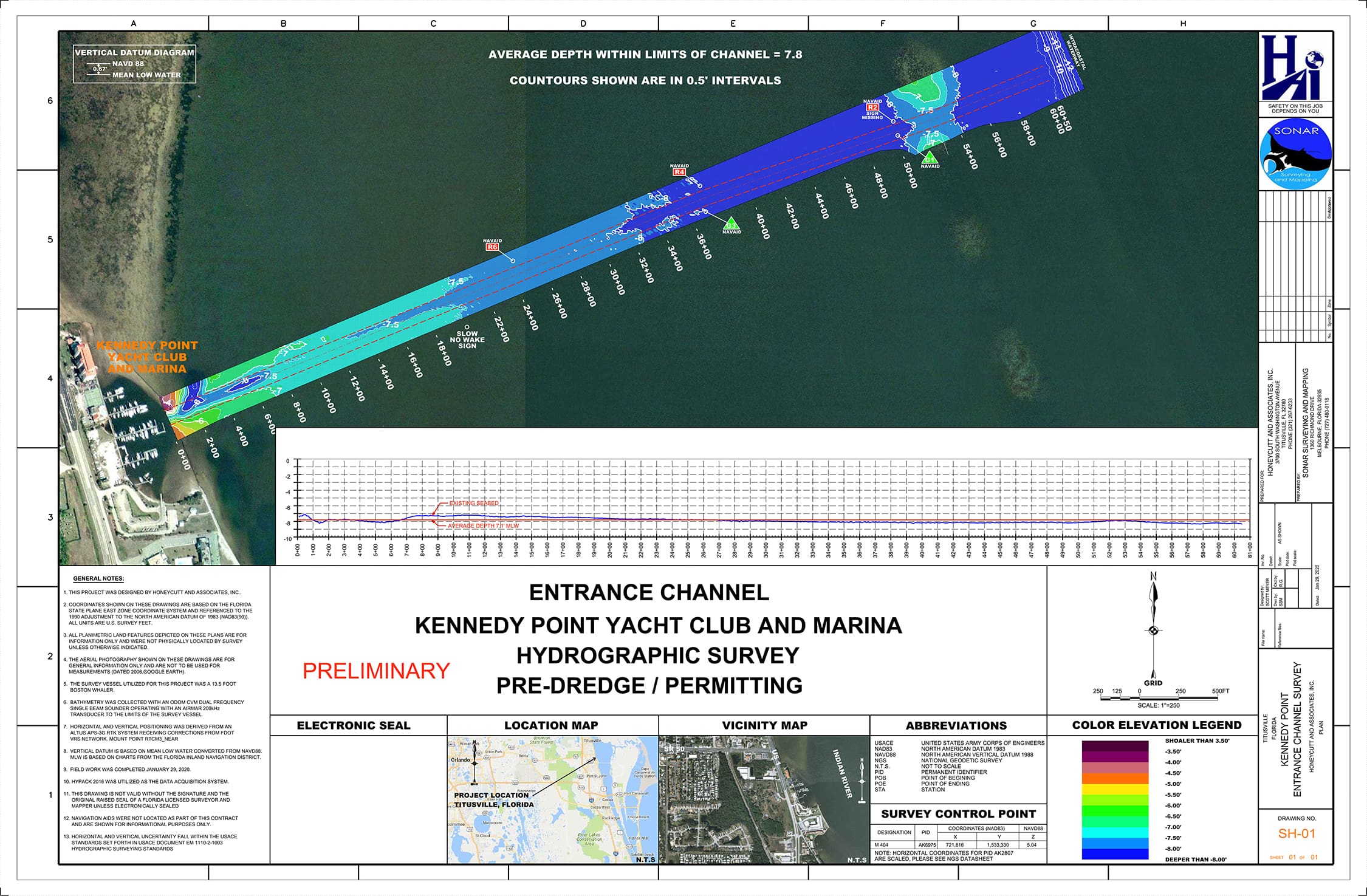 This image provides a hydrographic overview of the entrance channel to Kennedy Point Yacht Club and Marina. It is intended to assist boaters with safe approach and navigation to the facility. Depth contours are shown in 0.5-foot intervals, with an average channel depth of 7.8 feet at mean low water (MLW). Always navigate with caution and consult updated charts as conditions may change. For questions, please contact dockmaster@kennedypointmarina.com.